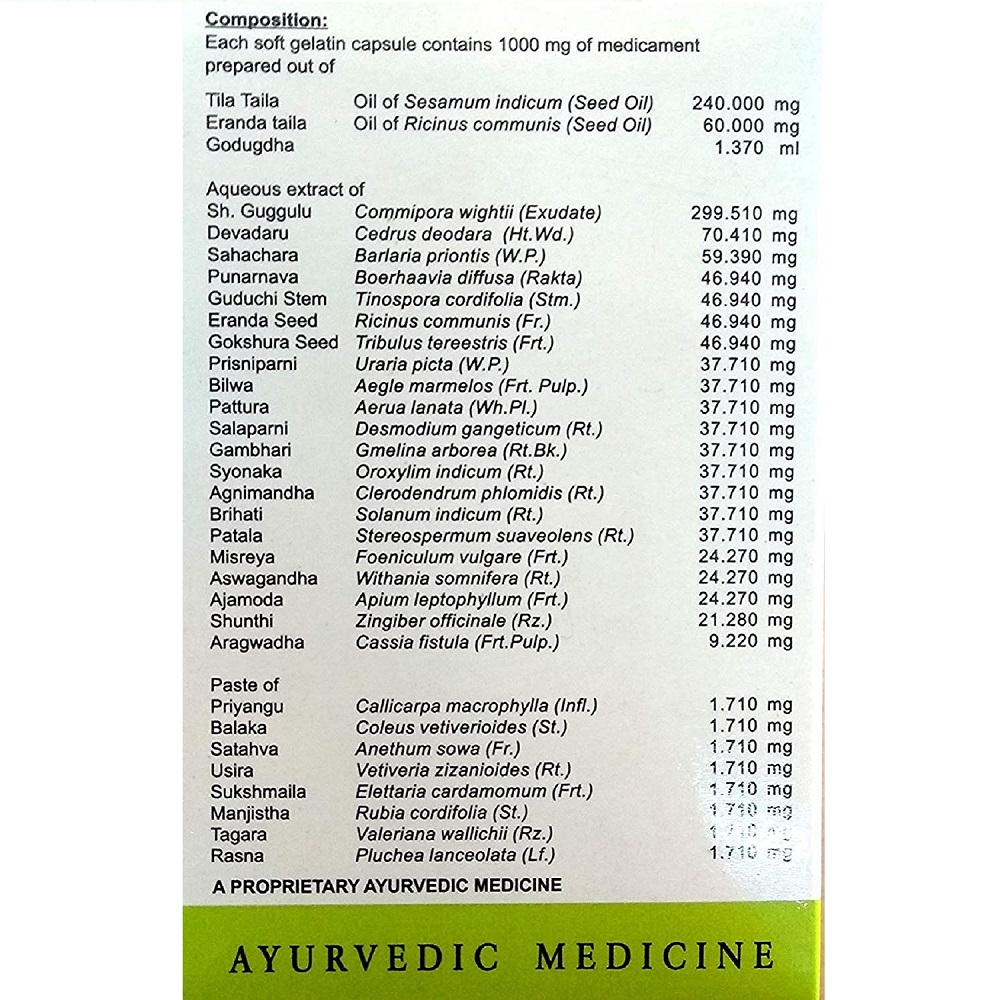 Oil of Sesamum indicam (Tila tailam). Oil of Ricinus communis (Eranda tailam), Milk (Go Ksheeram), Callicarpa macrophylla (Priyangu), Coleus vettiveroides (Valaka), Anethum sowa (Satapuspha), Vetiveria zizanioides (Usira), Elettaria cardamomum (Ela), Rubia cordifolia (Manjista), Valeriana wallichii (Nata), Alpinia galanga (Rasna), Tinospora cordifolia (Guduchi), Boerhaavia diffusa (Punarnava), Cassia fistula (Aragwadha), Tribuus terrestris (Gokshura), Peucedanum graveolens (Misi), Barleria prionitis (Sahachara), Zingiber officinale (Nagara), Ricinus communis (Eranda), Aegle marmelos (Vilvam), Aerua lanata (Bhadra), Desmodium gangeticam (Saliparni), Gmelina arborea (Kasmari), Oroxylum indicam (Syonakam), Uraria picta (Prisniparni), Premna integrifolia (Agnimantha), Solanum indicam (Brihati), Stereosperrmum suaveolens (Patala), Apium leptophyllum, Ajaji (Ajamoda), Withania somnifera (Aswagandha), Cedrus deodara (Devadaru), Commpihora mukul (Guggulu).